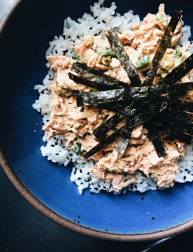 I have a lifelong love affair with Japanese food and I am in it for the long haul. Because I eat a mostly pescatarian diet, probably 60% of my food intake is some combination of vegetables, rice, and fresh or tinned fish and I am constantly searching for ways to put a spin on these ingredients. This recipe is inspired by one of the most famous Japanese comfort foods, onigiri, or rice balls. Onigiri (sometimes called o-musubi or nigirimeshi) are a portable, incredibly delicious rice ball made from steamed rice formed into a triangle shape and wrapped in dried seaweed (nori). Onigiri are often filled with salty, savory ingredients like salted pickled plum (umeboshi), simmered seaweed (kombu), or tuna mayo (canned tuna mixed with mayo, sometimes mixed with sriracha for spicy-tuna vibes). This last onigiri variation is the inspiration for this recipe.